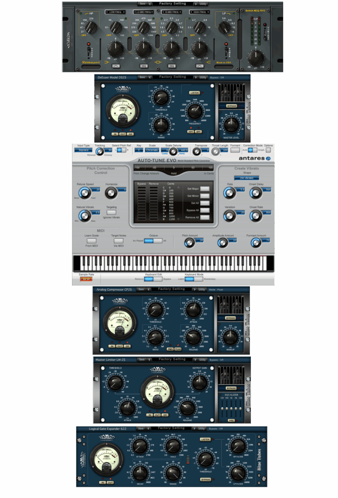 Fig 1. Algunos VSTs de ejemplo, desde arriba hacia abajo: British NEQ-1972, BT DeEsser DS2S-3, Auto-Tune Evo, BT Compressor CP2S-3, BT Limiter LM2S-3, BT ExpanderGate GX622-3.