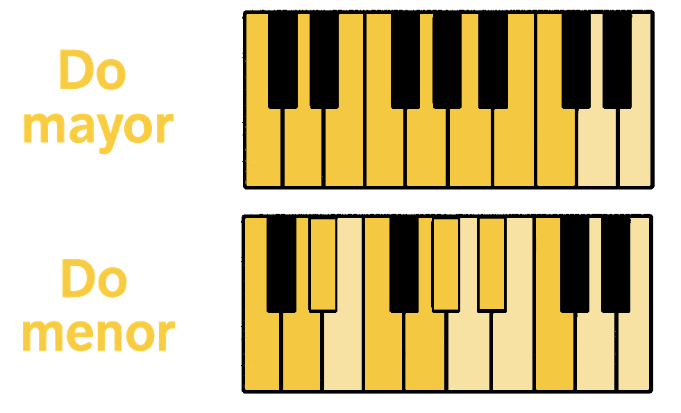 - Menor: Escala de 7 notas que contiene las notas Do–Re–Mi♭–Fa–Sol–La♭–Si♭-Do.